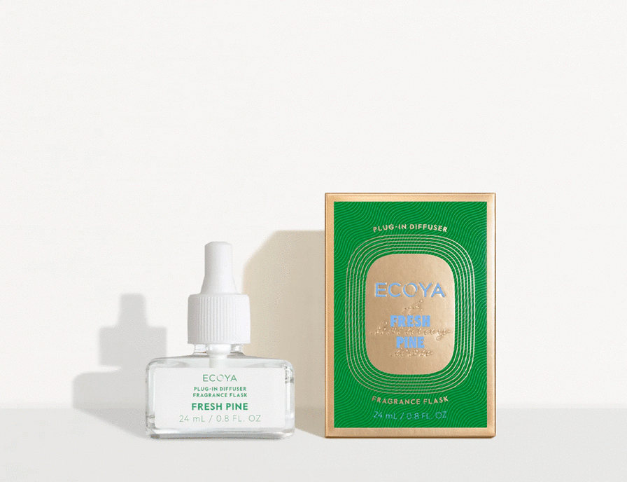 Fresh Pine Fragrance Flask Holiday Collection Perfumer's Notes Designed to seamlessly integrate with the ECOYA Plug-In Diffuser, the Fragrance Flask attaches effortlessly to the Plug-In Diffuser and fragrances your home for up to 700 hours. Crafted from glass, the flasks are fully recyclable. Simply replace the Fragrance Fask to switch scents. ECOYA Plug-In Diffuser sold separately. Fragrance Notes: A holiday icon; It’s not just a scent, it’s a memory, a tradition and an annual sell-out sensation. Immerse yourself in the nostalgia of freshly cut Christmas trees, blended with forest woods, rosewood, a citrus kick and a touch of cedar. Fragrance Family: Woody Top Notes: Citrus, Gergamot, Pine, Herbal, Spice Middle Notes: Ylang-ylang, Rosewood, Strawberry Base Notes: Musk, Cedarwood