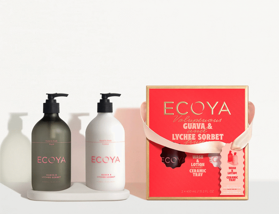 Holiday: Bathroom Gift Set Guava & Lychee Sorbet A voluptuous fruity fragrance with tropical layers of guava nectar, Queensland lychee and a cocktail of berries. Product Description Introducing the Bathroom Gift Set, featuring our much-loved Hand & Body Wash and Lotion. This luxurious duo is perfect for keeping your skin cleansed, nourished and moisturised. Paired with a chic ceramic tray - our first-ever, thoughtfully designed to elevate your bathroom accessories. Add a touch of sophistication to your holiday rituals or gift it to someone special this festive season. Available in our much loved ECOYA fragrances, French Pear and Guava & Lychee Sorbet.