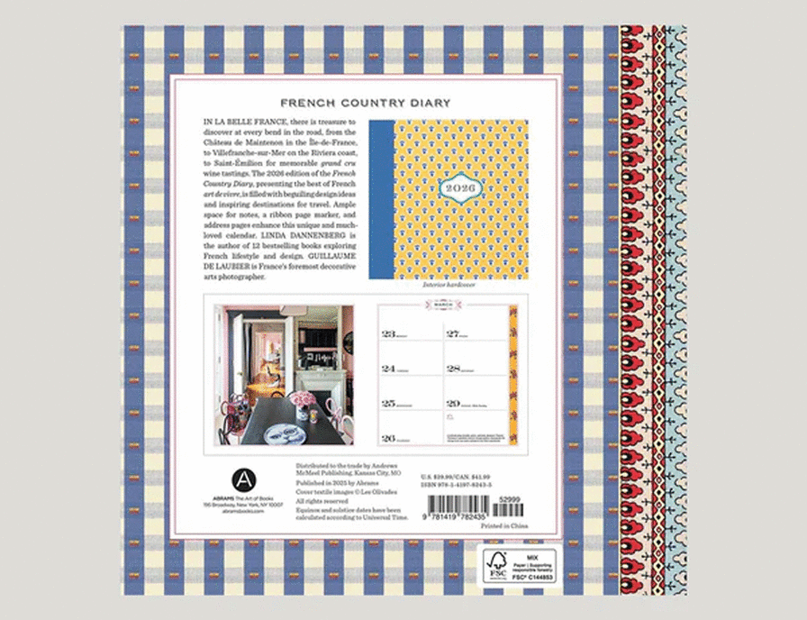 French Cntry Diary 2026 Sale price$49.90 NZD or 4 interest-free payments of $12.48 with ⓘ Escape to the French countryside year-round with this elegant, clothbound desk diary featuring lush photography and captivating details about France's hidden treasures. The 38th edition of the French Country Diary celebrates France with 52 weeks of Gallic style and romantic discovery. From Normandy and Nice to Paris and Provence, every week reveals a memorable stop in la belle France with gorgeous photography, design ideas, and travel inspiration. Ample space for notes, a grosgrain ribbon marker, and address pages enhance this beautiful, much-loved calendar. - 21.6 x 2 x 21.3 cm (8" x 8" / 16" x 8" open) - 128 pages - Hardcover with durable cloth spine - Printed on FSC-certified paper with soy-based ink - Packaged in a full-colour slipcase - Ribbon marker - Monday–Sunday weeks - Generous grid space for notes, appointments, and reminders - Official major world holidays and observances - Year-at-a-glance pages for 2026 and 2027 - Address pages - Additional information for a selection of featured sites - A brief descriptive text accompanies each photograph