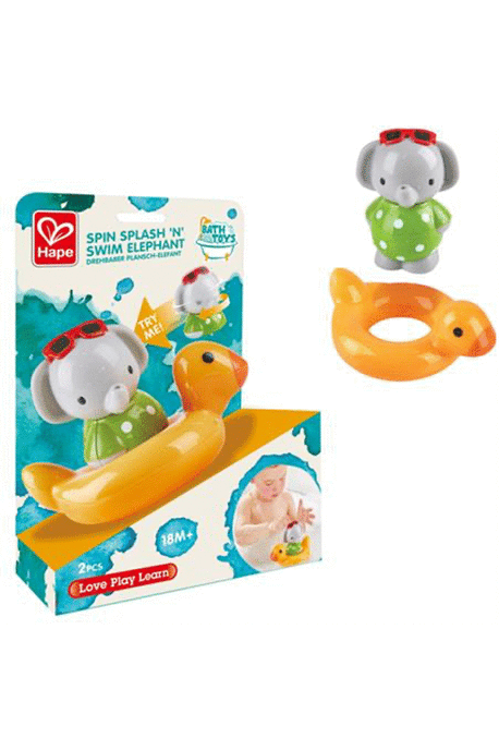 Hape Spin Splash n Swim Elephant Spin Splash n Swim Elephant • A spinning bath time elephant with duck ring • Wind the elephant up by twisting her then place her in the duck ring to spin in the water • You can also place the elephant in the water to watch her roll around happily or just on the floor where she will spin her head • In warm water the duck will transform from orange to yellow. The color will return to normal when the temperature falls below 35°C Ages 18 month +