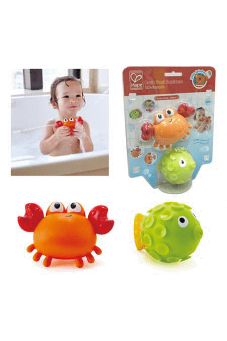 Hape Rock Pool Squirters This cute crab and fish have a cheeky secret! If you fill them up with water and squeeze them they will shoot out water. Brings splashy fun to bath time! Recommended Age12M+ Package Dimensions: 180 x 240 x 80 mm"