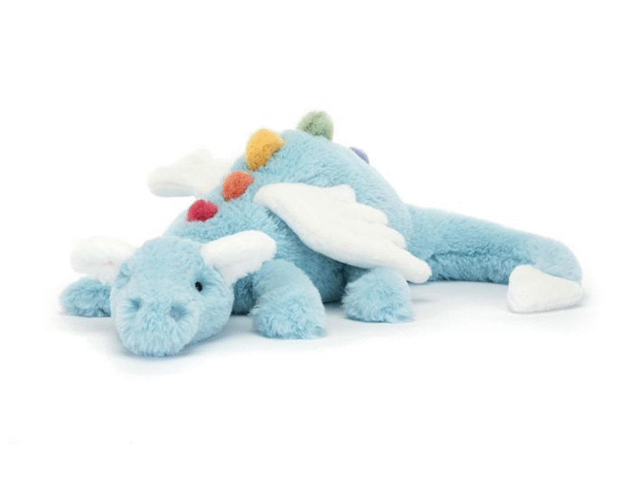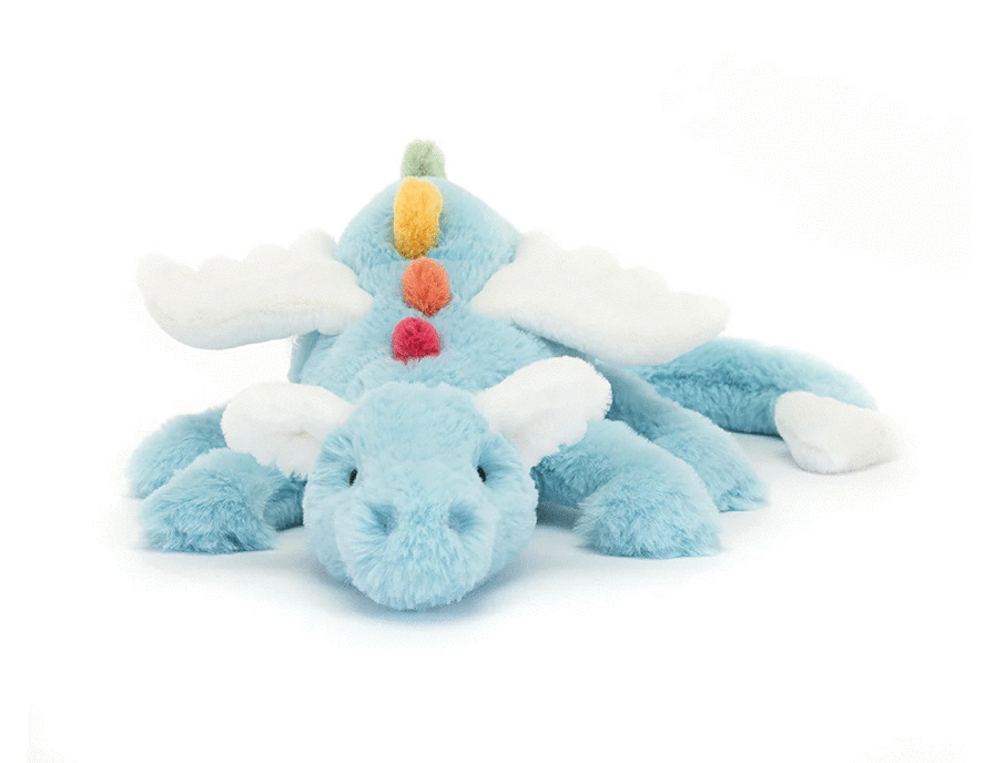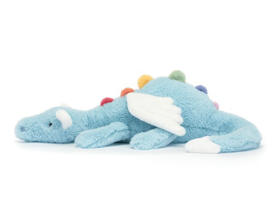 Prepare to be dazzled as Sky Dragon comes in to land! This magical friend has a long sky-blue body and soft rainbow spines from back to tail! With a cuddly snout, bobble nostrils and cloud-white wings, ears and tail dart, this sleepy dragon is an absolute dream.