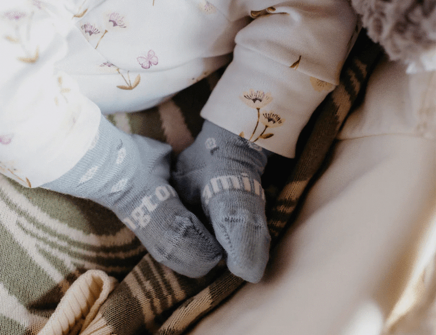Tahnee - Light blue with little flowers merino wool crew socks for babies. Also available in Lamington Woman + Child New Zealand Made, sizes knitted into every pair so no confusion over whose are whose! 70% Merino Wool, 25% Nylon + 5% Elastane Colours may vary slightly to photo depending on the batch.