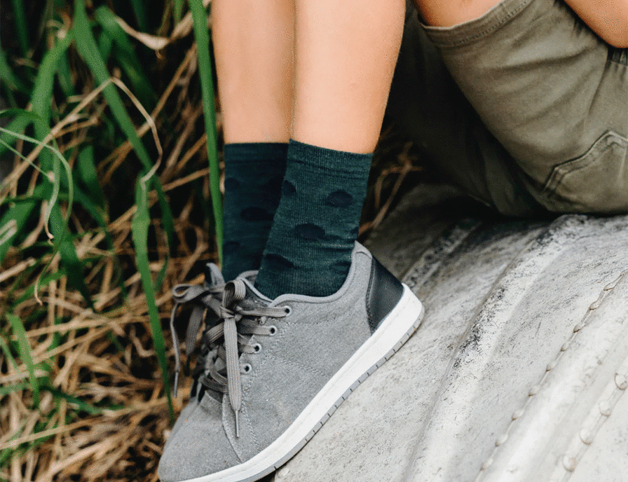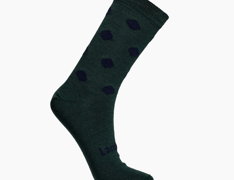 Caspian - Dark Green with Blue spots merino wool crew socks for children. Also available in Lamington Man. New Zealand Made, sizes knitted into every pair so no confusion over whose are whose! 70% Merino Wool, 25% Nylon + 5% Elastane Colours may vary slightly to photo depending on the batch.