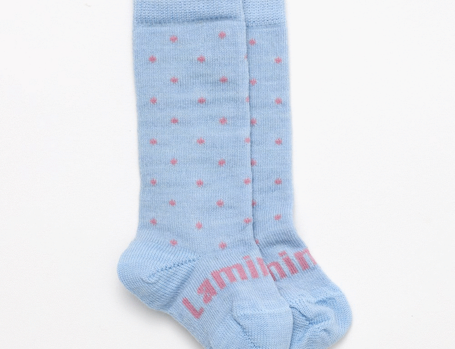 Harriet -Light blue with lilac spots merino wool knee-high socks for babies. New Zealand Made, sizes knitted into every pair so no confusion over whose are whose! 70% Merino Wool, 25% Nylon + 5% Elastane Colours may vary slightly to photo depending on the batch.