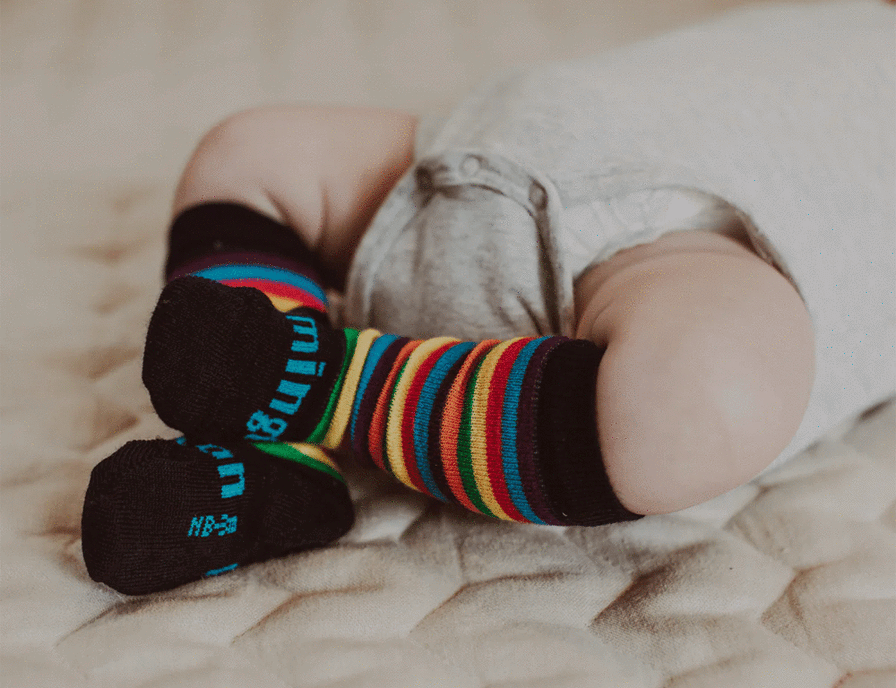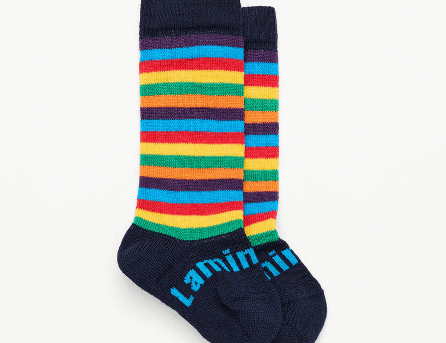 Jester - Navy, red, blue, yellow, green, purple and orange striped merino wool knee-high socks for babies Also available in Child Knee-High and Lamington Man, Woman in Crew New Zealand Made, sizes knitted into every pair so no confusion over whose are whose! 70% Merino Wool, 25% Nylon + 5% Elastane Colours may vary slightly to photo depending on the batch.