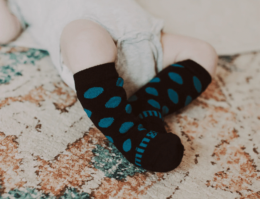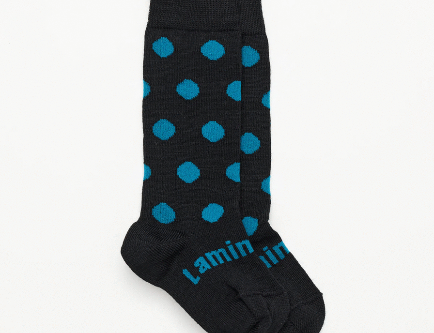 Neo - Black with blue spots merino wool knee-high socks for babies. Also available in Lamington Woman + Child plus in crew for Men New Zealand Made, sizes knitted into every pair so no confusion over whose are whose! 70% Merino Wool, 25% Nylon + 5% Elastane Colours may vary slightly to photo depending on the batch.