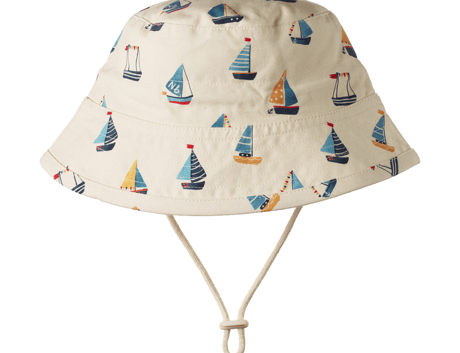 bucket sunhat A classic Bucket Hat made from organic cotton canvas, these Bucket Hats give baby's delicate skin great protection and keeps the sun out of their eyes with a large full brim. The sizing can be adjusted with the drawstring and toggle at the back. A drawcord and toggle at the chin helps to keep the hat on little one's head. To minimise shrinkage, this fabric has been pre-washed. * GOTS certified CU 862149 * 100% organic cotton canvas outer * 100% organic cotton poplin lining * drawcord at chin with toggle * drawcord around head with toggle for adjustable fit * medium approx 6m-2y * large approx 2y-4y