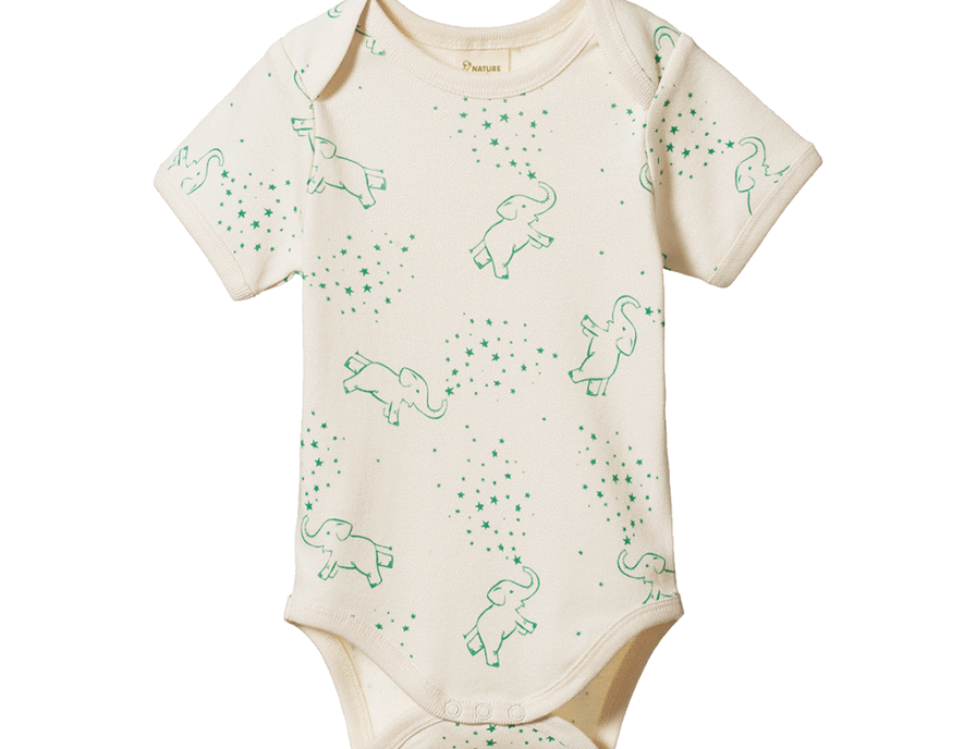 short sleeve bodysuit An essential for the layette. The first thing most babies wear is a bodysuit. Easy snap domes to ensure baby's tummy and back are covered and make for easy nappy changes. Soft organic cotton offers supreme comfort for your little one. Great for layering. To minimise shrinkage, this fabric has been pre-washed. * GOTS certified CU 862149 * 100% organic cotton rib * easy snap YKK domes * envelope neckline