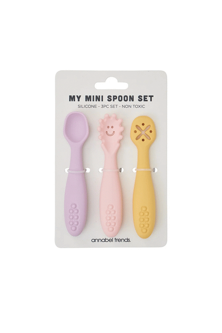 SILICONE Cutlery Set (3 pcs) Sunset DESCRIPTION SPECIFICATIONS Learning how to use a spoon, fork or knife is tricky. The mini spoon set is perfect for learning to pick up food – these spoons are different styles to help your baby scoop, dip and grab. Soft silicone makes them chewable, and they are dishwasher safe.