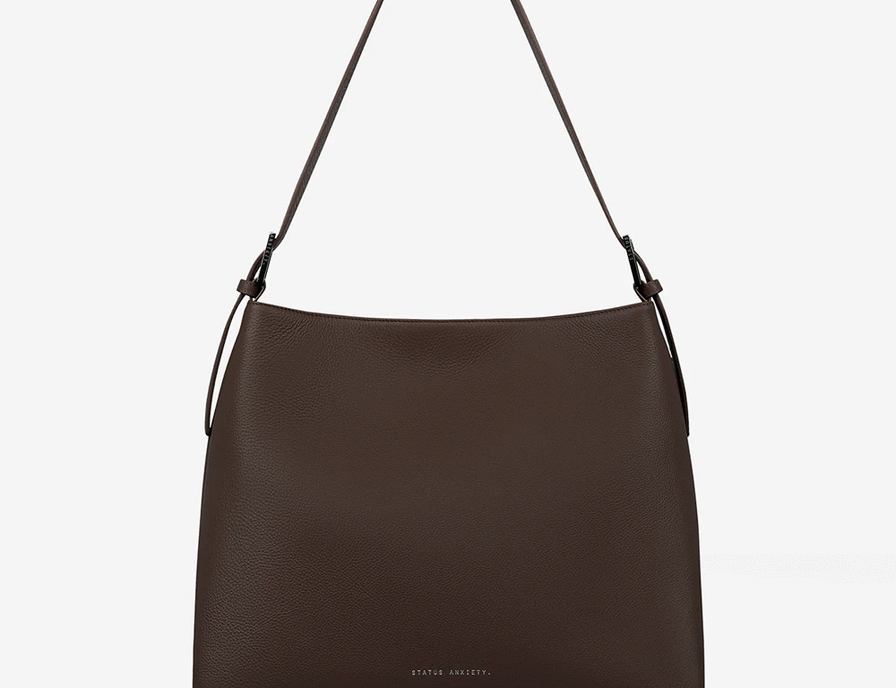 Forget About It Bag - Cocoa Built to handle almost any size impulse purchase, the 'Forget About It' bag has a magnet close top, an edgy angular silhouette, and branded strap buckles. Soft shrunken pebble leather Custom Status Anxiety lining Internal zipper pocket, and open pouch pockets Large internal zipper pocket Magnet close Custom Status Anxiety branded buckles Comes in a Status Anxiety branded drawstring bag